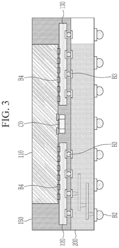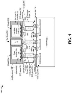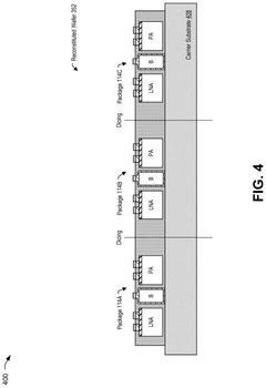 Technical Solution: Qualcomm has developed advanced chiplet integration strategies focusing on mobile and edge computing applications. Their approach leverages System-in-Package (SiP) technology that combines multiple chiplets in a single package to optimize performance, power efficiency, and form factor. Qualcomm's chiplet architecture employs high-density interconnects with reported bandwidths exceeding 1 Tbps between dies while maintaining power efficiency below 1 pJ/bit. Their RF-SOI (Radio Frequency Silicon-on-Insulator) technology enables integration of RF components with digital processing chiplets, critical for 5G applications. Qualcomm has implemented heterogeneous integration in their Snapdragon platforms, combining application processors, modems, and specialized accelerators as separate chiplets. Their approach emphasizes die-to-die interfaces that minimize latency (under 2ns) and power overhead while maximizing bandwidth for mobile applications where power constraints are paramount.
