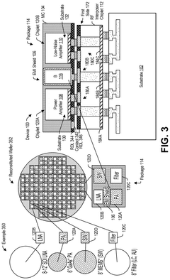 - Heterogeneous integration and process technology compatibility: Heterogeneous integration enables combining chiplets manufactured using different process technologies, allowing optimization of each component for its specific function. This approach presents challenges in managing different material properties, thermal expansion coefficients, and electrical characteristics. Solutions include advanced interface standards, die-to-die communication protocols, and adaptive compensation techniques. Successful heterogeneous integration enables combining high-performance logic, memory, analog, and RF components in a single package, offering significant advantages in performance, power efficiency, and system flexibility.