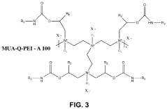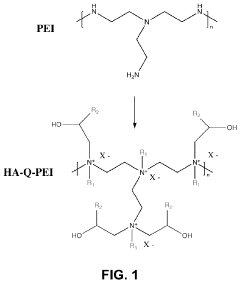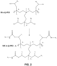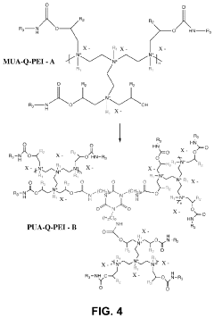 - Development of antimicrobial compositions comprising quaternary ammonium polymers formed from polyethyleneimine oligomers, multifunctional crosslinkers, alkylating agents, and monoisocyanates, which are reacted to create durable, water-resistant, and cost-effective coatings with enhanced antimicrobial properties.