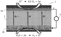 Technical Solution: Topsoe has developed proprietary SOEC stack technology with exceptional durability through their advanced ceramic materials engineering. Their SOECs utilize a unique composite structure with yttria-stabilized zirconia (YSZ) electrolytes and specialized nickel-based fuel electrodes that demonstrate degradation rates below 0.5% per 1000 hours under pressurized operation. Topsoe's technology incorporates protective coatings on interconnects to mitigate chromium poisoning and employs nano-engineered oxygen electrodes with mixed ionic-electronic conductors to enhance electrochemical performance while maintaining structural integrity. Their systems operate at intermediate temperatures (650-750°C) to balance performance with longevity, and utilize proprietary sealing materials that withstand thermal cycling while preventing gas leakage. Topsoe has demonstrated multi-year continuous operation in industrial settings with minimal performance loss through their integrated stack design that manages thermal gradients and mechanical stress.