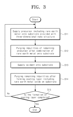 - A superhydrophobic coating material is developed using a substrate with a three-dimensional nano structure and a coating layer of rare earth metal oxides, such as Y2O3, Dy2O3, La2O3, CeO2, or Er2O3, formed through atomic layer deposition, maintaining superhydrophobic properties even after heat treatment at 500°C for 2 hours.