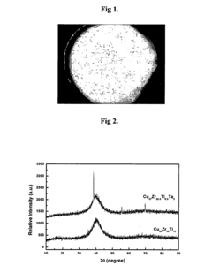 Amorphous metals find applications across numerous industries due to their unique property combinations. They are used in electronic devices as transformer cores and magnetic sensors due to their soft magnetic properties. In medical fields, they serve as biocompatible implants and surgical instruments. Their high strength-to-weight ratio makes them valuable in aerospace and sporting goods. Additionally, their corrosion resistance is utilized in chemical processing equipment, while their wear resistance is beneficial for cutting tools and protective coatings.Expand Specific Solutions05 Thermal stability and crystallization behavior