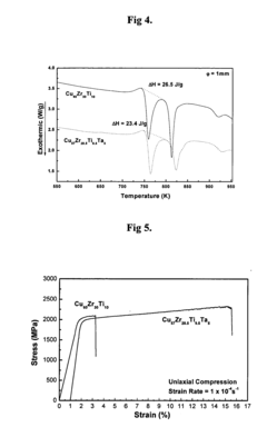 Amorphous metals can be created from various alloy systems, each offering unique properties. Common compositions include iron-based, zirconium-based, titanium-based, and aluminum-based alloys with specific combinations of elements that enhance glass-forming ability. These compositions often include metalloid elements like boron, silicon, or phosphorus that help stabilize the amorphous structure. The specific elemental ratios are critical in determining the material's thermal stability, mechanical properties, and resistance to crystallization.Expand Specific Solutions03 Mechanical and physical properties of amorphous metals