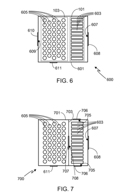 Technical Solution: Samsung SDI has developed a comprehensive thermal management system to prevent battery thermal runaway. Their approach includes multi-layered safety mechanisms with thermal separation technology that physically isolates cells to prevent propagation of thermal events. The company utilizes advanced ceramic-coated separators that maintain structural integrity at high temperatures (up to 180°C) compared to conventional polyolefin separators that shrink at 130°C. Samsung's thermal management system incorporates phase change materials (PCMs) that absorb excess heat during operation, effectively regulating battery temperature. Their Battery Management System (BMS) employs predictive algorithms to detect early signs of thermal abnormalities through continuous monitoring of voltage, current, and temperature parameters across multiple points in the battery pack. Additionally, Samsung has implemented pressure-sensitive current interrupt devices that physically disconnect cells when internal pressure exceeds safety thresholds due to gas generation during thermal events.