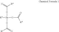 - A semiconductor photoresist composition is developed, comprising a condensed product from a condensation reaction between an organotin compound and organic acid compounds, which enhances sensitivity and storage stability, and includes a solvent and optional additives like surfactants and crosslinking agents, forming a pattern with improved aspect ratio and resistance to moisture.