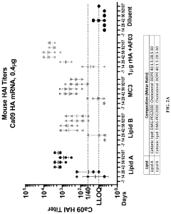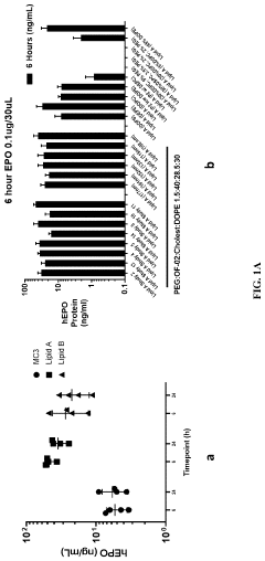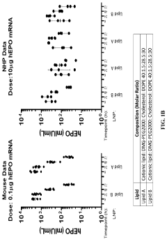 The composition of lipid nanoparticles can be precisely tailored to optimize performance for specific applications. By adjusting the ratios of ionizable lipids, helper lipids, cholesterol, and PEG-lipids, researchers can fine-tune properties such as particle size, surface charge, encapsulation efficiency, and release kinetics. This customizability allows for the development of application-specific LNP formulations that maximize therapeutic efficacy while addressing particular delivery challenges for different mRNA cargoes and target tissues.Expand Specific Solutions05 Reduced immunogenicity and enhanced safety profile