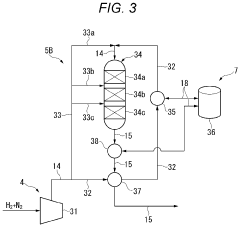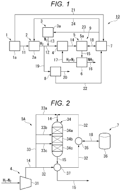 Advanced heat recovery systems significantly improve the thermal efficiency of ammonia production. These technologies capture waste heat from various process stages and redirect it to preheat feedstocks, generate steam, or power other process units. Multi-stage heat exchangers, thermal energy storage systems, and pinch analysis optimization techniques minimize energy losses throughout the production cycle, resulting in substantial reductions in overall energy consumption and improved process economics.Expand Specific Solutions04 Novel reactor designs for ammonia synthesis