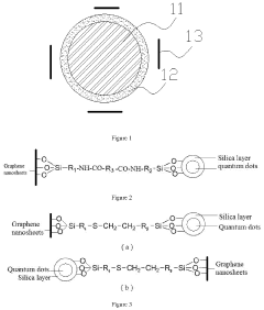 Core-shell quantum dot structures significantly enhance stability by providing physical barriers against environmental factors. The shell material, typically a semiconductor with a wider bandgap than the core, protects the core from oxidation and chemical degradation. Multi-shell structures can further improve stability while maintaining or enhancing the optical and electronic properties of the quantum dots.Expand Specific Solutions03 Polymer encapsulation for quantum dot stabilization