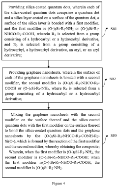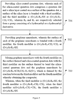 - A composite is formed by bonding silica-coated quantum dots with graphene nanosheets using specific silane coupling agents, creating a stable and efficient light-emitting layer material that enhances thermal and water/oxygen resistance without affecting the optical properties of the quantum dots.