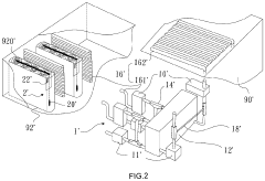 Technical Solution: Samsung SDI has developed an advanced Battery Thermal Management System (BTMS) that utilizes both active and passive cooling strategies. Their system incorporates a liquid cooling circuit with specialized heat exchangers that maintain optimal temperature distribution across battery modules. Samsung's approach includes phase-change materials (PCMs) integrated into battery packs to absorb excess heat during high-discharge operations. Their proprietary thermal interface materials improve heat transfer between cells and cooling plates, reducing thermal resistance by up to 30%. Samsung has also implemented predictive thermal management algorithms that anticipate temperature changes based on usage patterns and environmental conditions, allowing the system to proactively adjust cooling capacity before thermal issues arise. Recent innovations include their "Cell-to-Pack" design that eliminates module housings, improving thermal conductivity throughout the entire battery system.