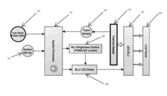 - A method to temporarily increase the electrical current to LEDs in the backlight unit (BLU) for brief periods, allowing for higher brightness without continuous power consumption and heat issues, using a denser LED array and thermal ballast to manage heat dissipation.