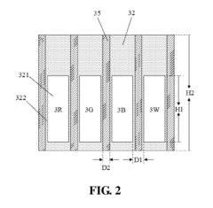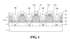 Innovative pixel structures are developed to achieve higher resolution in display technologies. These include specialized arrangements of sub-pixels, novel electrode designs, and advanced thin-film transistor (TFT) configurations. Such structures enable more precise control of light emission or transmission, resulting in displays with higher pixel density, improved color accuracy, and enhanced overall visual quality for both WOLED and N-Doped LCD technologies.Expand Specific Solutions