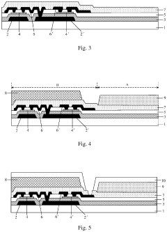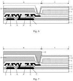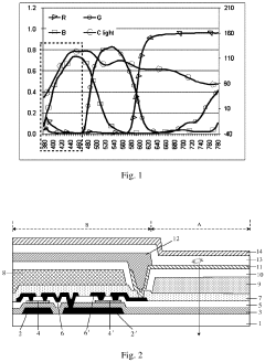 Technical Solution: BOE has developed a hybrid approach to OLED technology that incorporates elements of both WOLED and RGB OLED designs. Their "QLED-OLED" technology utilizes blue OLED emitters combined with quantum dot color conversion materials, similar to Samsung's approach but with proprietary manufacturing techniques. BOE's panels feature a tandem structure where multiple OLED emission layers are stacked to distribute current load, extending panel lifespan while improving energy efficiency. Their latest panels incorporate micro-cavity structures that enhance light extraction efficiency by approximately 25%[5]. BOE has also implemented advanced thin film transistor (TFT) backplane technology using oxide semiconductors (IGZO) that reduces power consumption by approximately 15-20% compared to conventional a-Si TFTs[6]. Additionally, BOE has developed AI-driven power management algorithms that dynamically adjust pixel brightness based on content, further reducing energy consumption by up to 10% during typical usage scenarios.